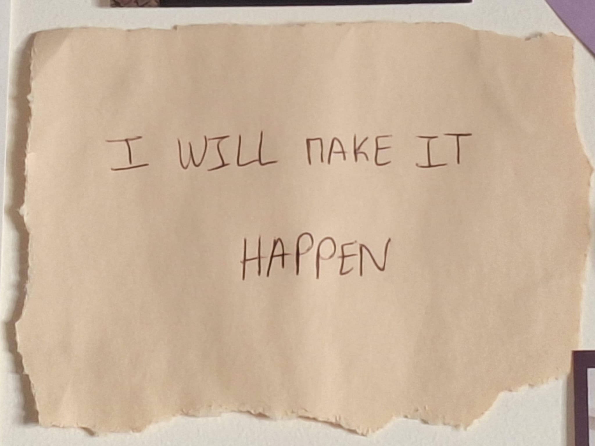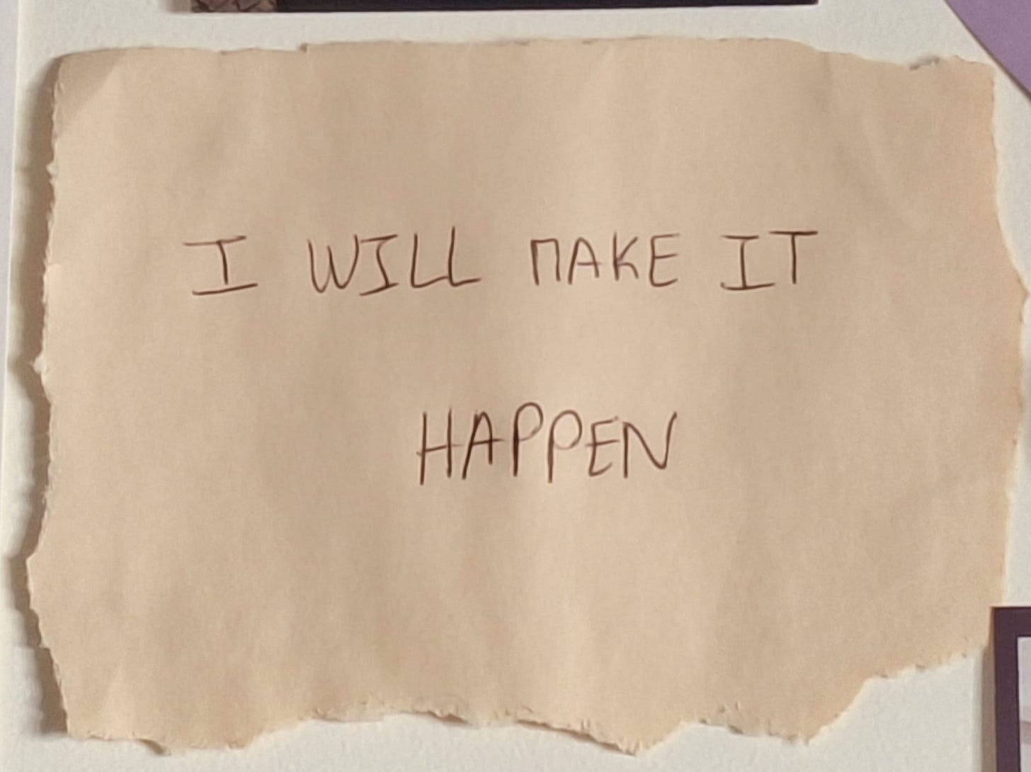 My head rises to the yellowed page glued to my wall. I will make it happen written on it in rushed letters.